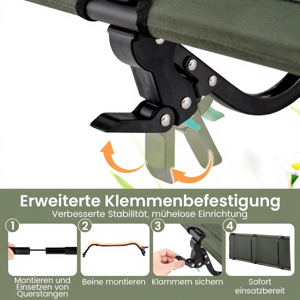 This camping lounger combines durability and convenience with its foldable design and lightweight construction. It includes a side pocket for storing essentials and is made from robust materials to withstand outdoor use while providing a comfortable resting surface.